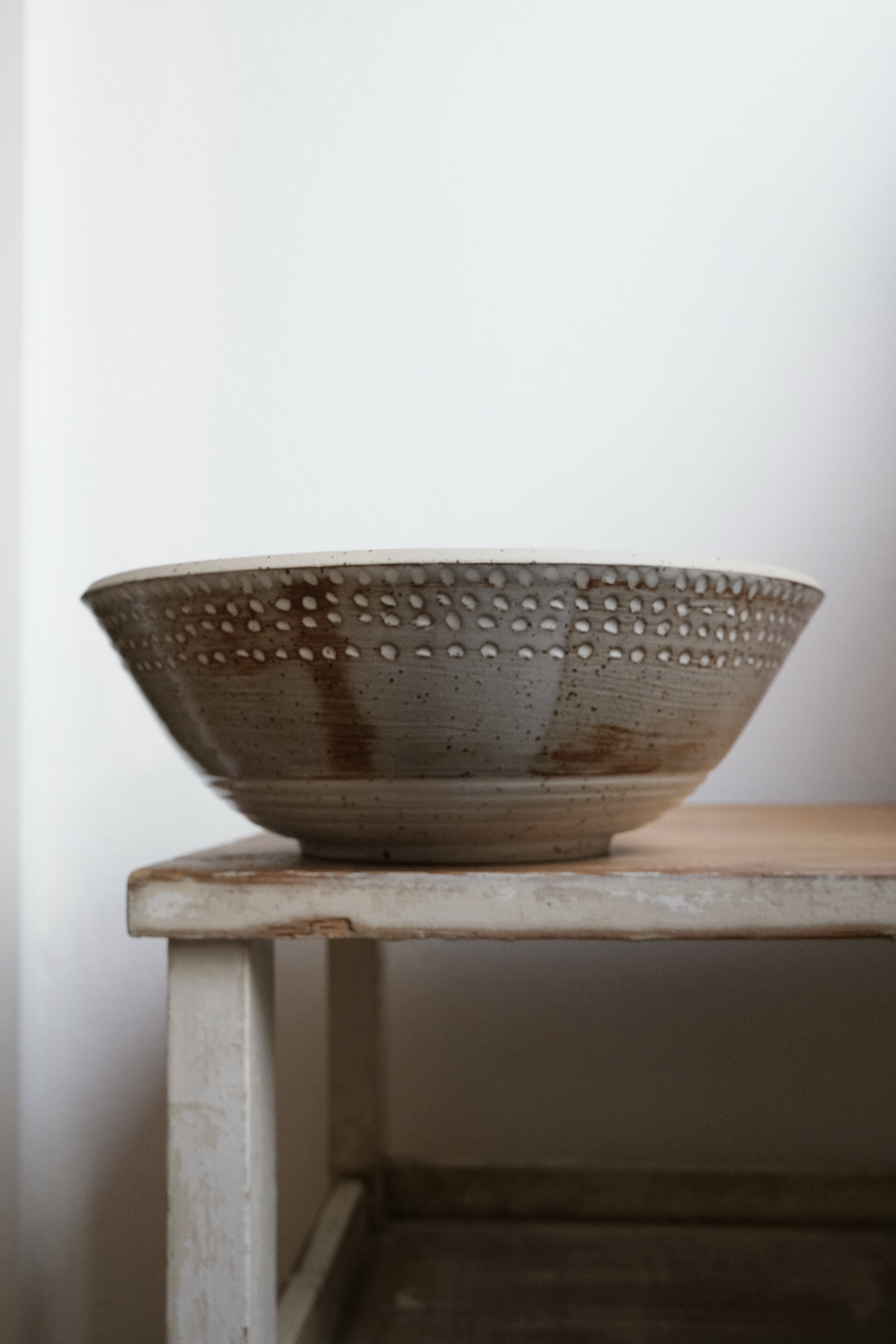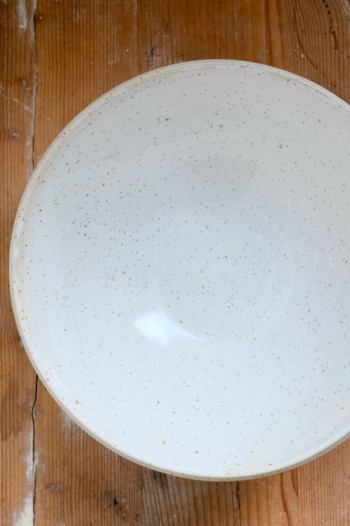 Ein besonderes Einzelstück, perfekt für Salate/ Obst/ und vieles mehr, Tonfarbe Hellbeige mit Spots, weiß glasiert, außen mit Engobe gestaltet, H 8,5cm, Durchmesser oben 25cm, Fassungsvermögen 2000ml.