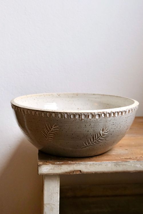 Perfekt für Salate und vieles mehr, Tonfarbe Hellbeige, Weiß glasiert, außen mit Engobe gestaltet/ geschnitzte fedrige Blätter, unique, H 8,5 cm, Durchmesser oben 23cm, Fassungsvermögen 2000ml.