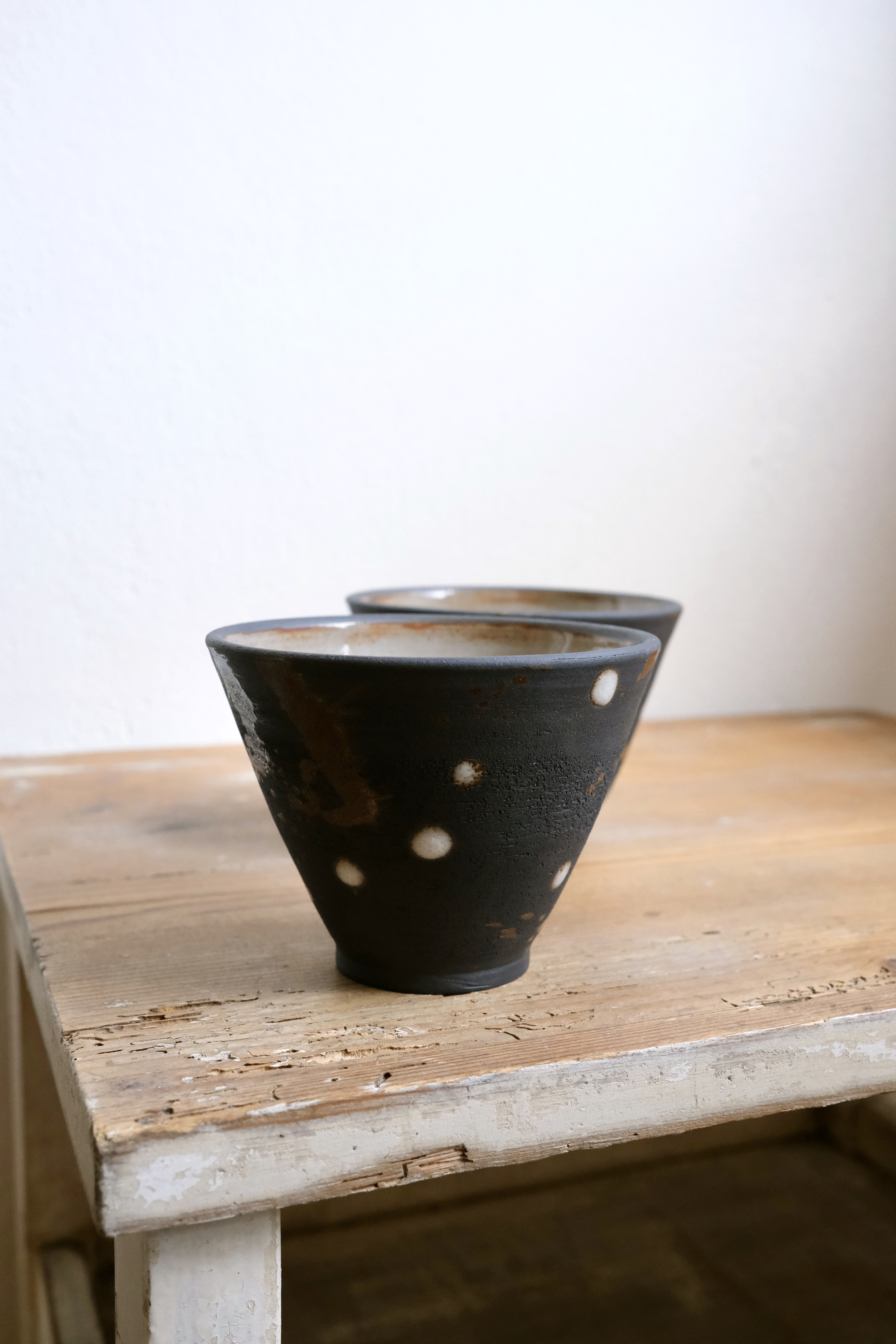 Kleine Bowl zum Servieren von Kleinigkeiten, Tonfarbe Schwarz, innen weiß glasiert, außen natürliche Haptik von gebranntem Ton mit Klecksen, H 8cm, 230ml.