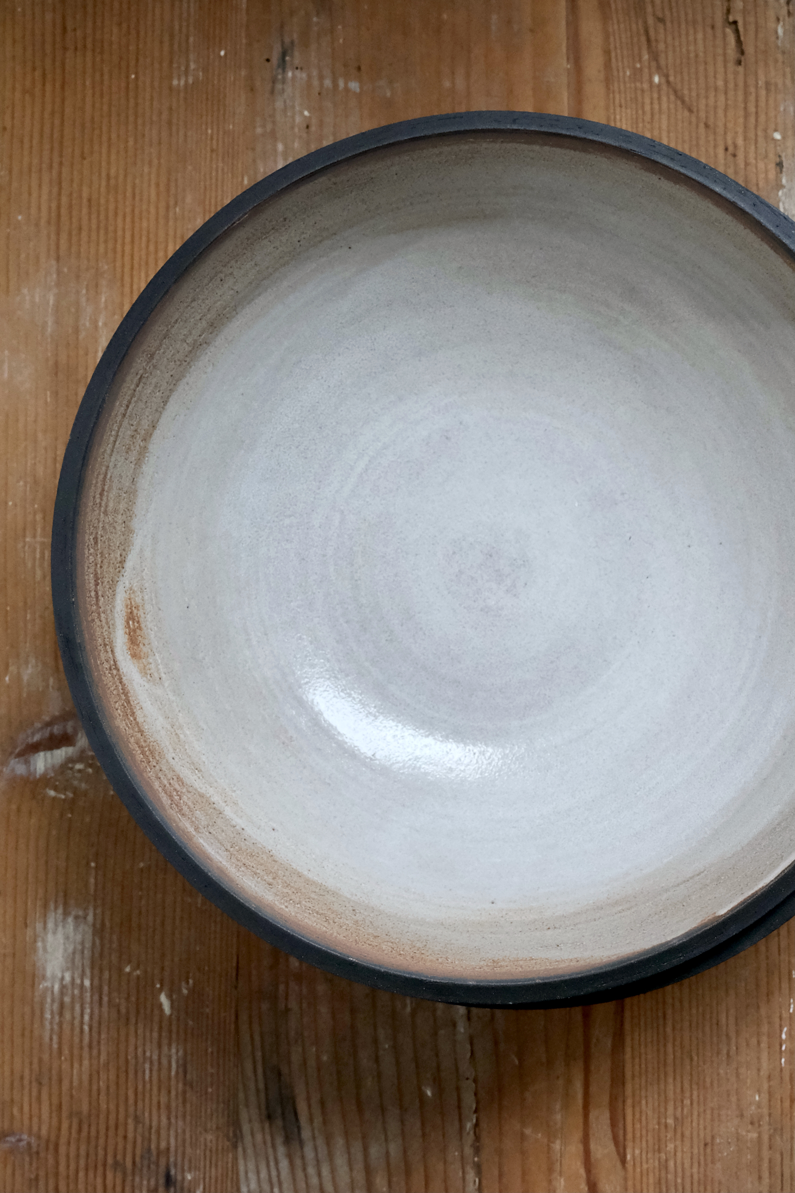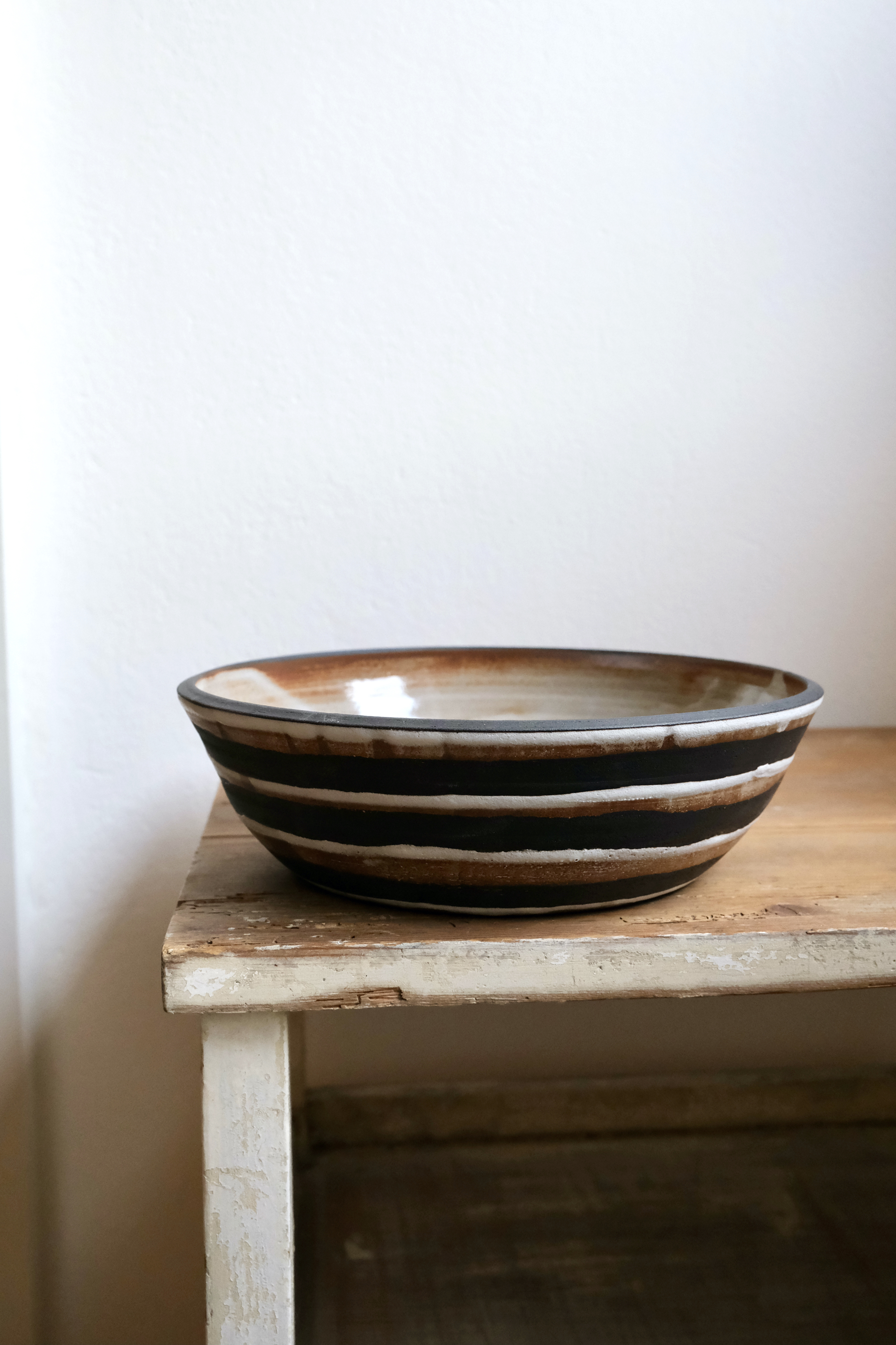 Perfekt für Salate/ Suppen/ Ramen/ und vieles mehr, Tonfarbe Schwarz, innen weiß glasiert/ außen gestreift/ individuell mit Farbverlauf, H 6cm, Fassungsvermögen 1200ml.