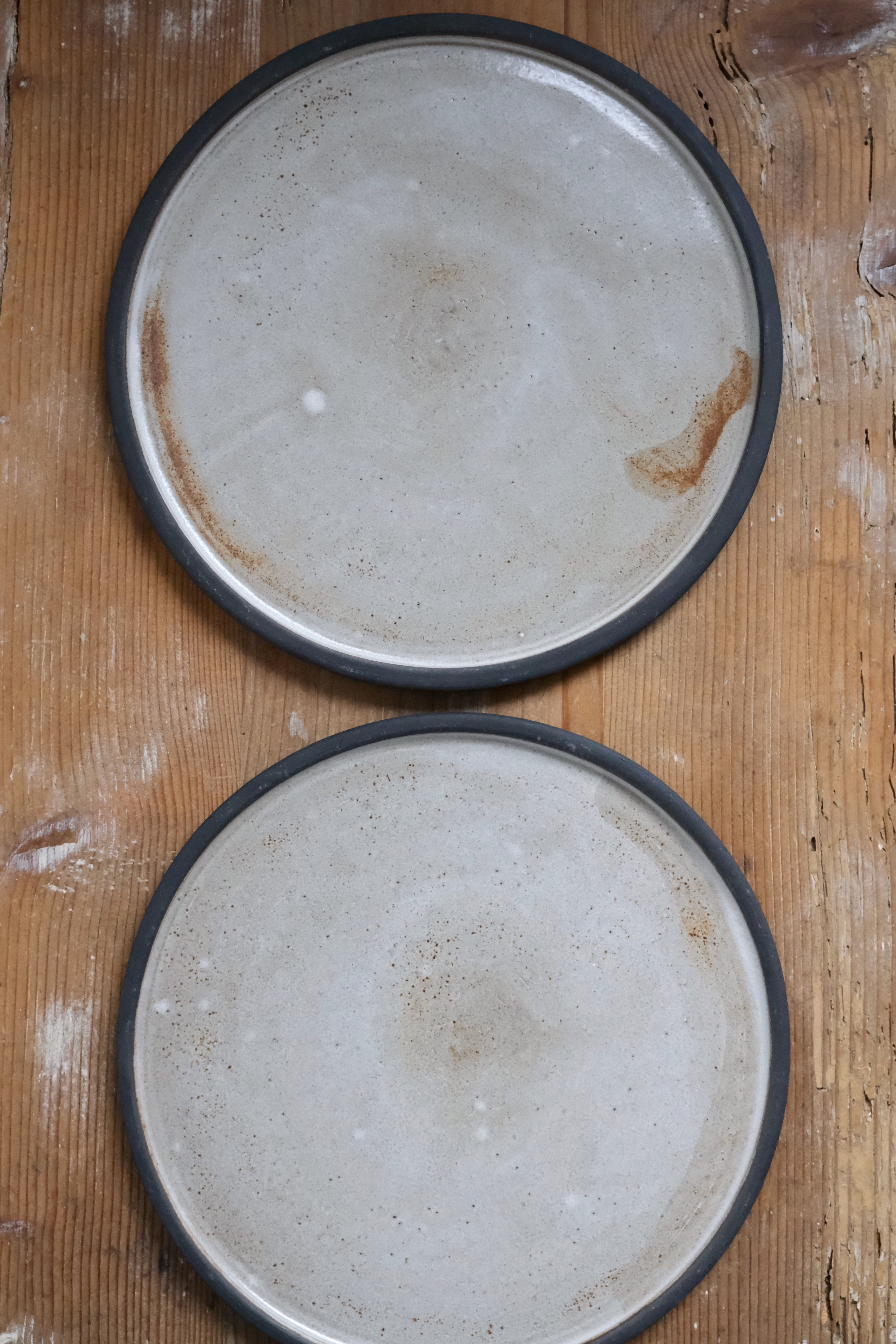 Zwei Teller als Set/ Frühstücksteller/ unique, Tonfarbe Schwarz, Weiß glasiert, außen natürliche Haptik des gebrannten Tons, Durchmesser 20cm.