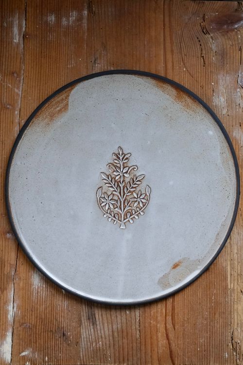 Großer Teller für Kuchen oder Tapas, Tonfarbe Schwarz, Weiß glasiert mit Farbverlauf, besonders mit dem Stempel, flacher Rand, Durchmesser 26,5cm.