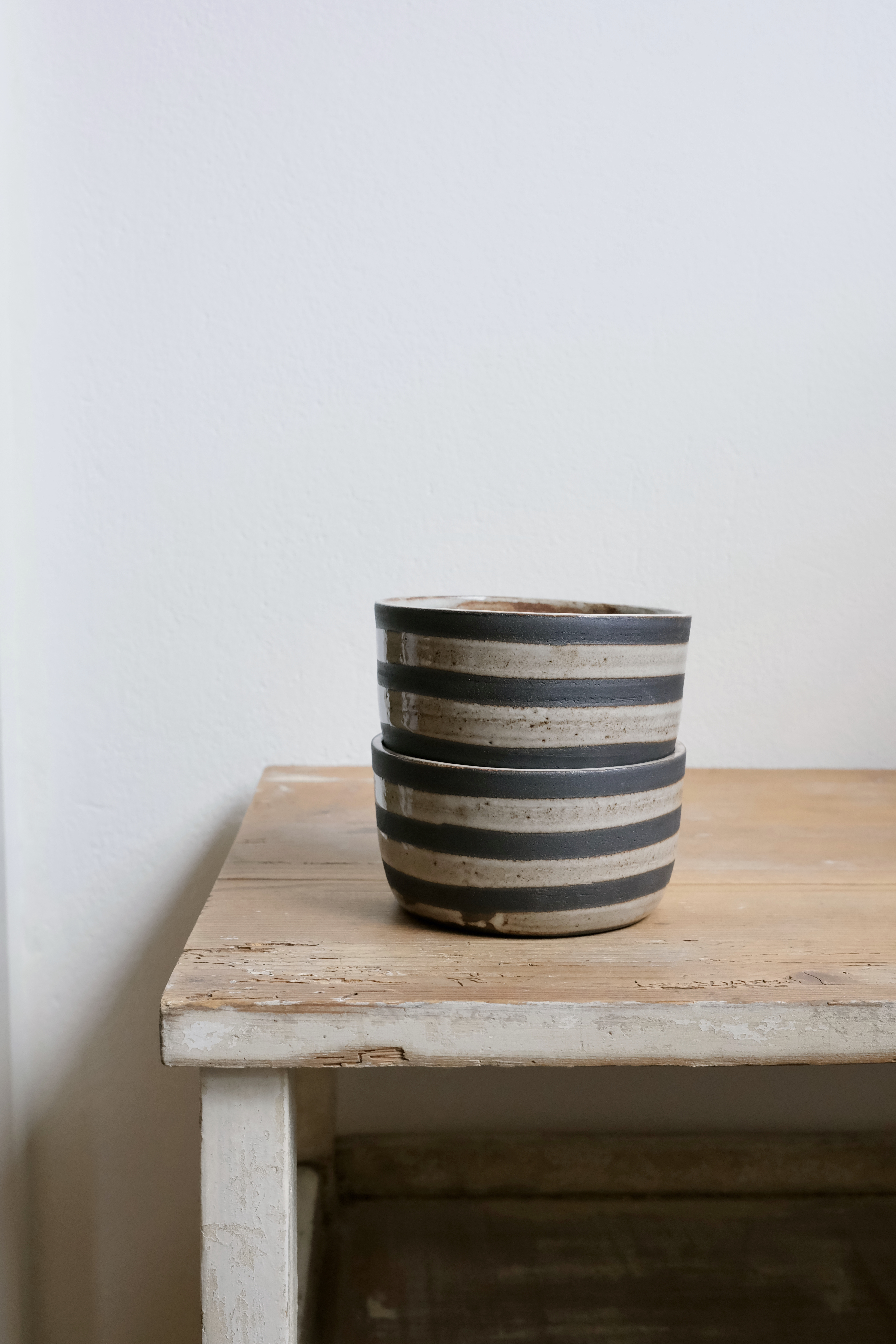 Süße Bowl für Kleinigkeiten, Tonfarbe Schwarz, innen weiß glasiert, außen mit Streifen, H 5,5cm, Fassungsvermögen 300ml.