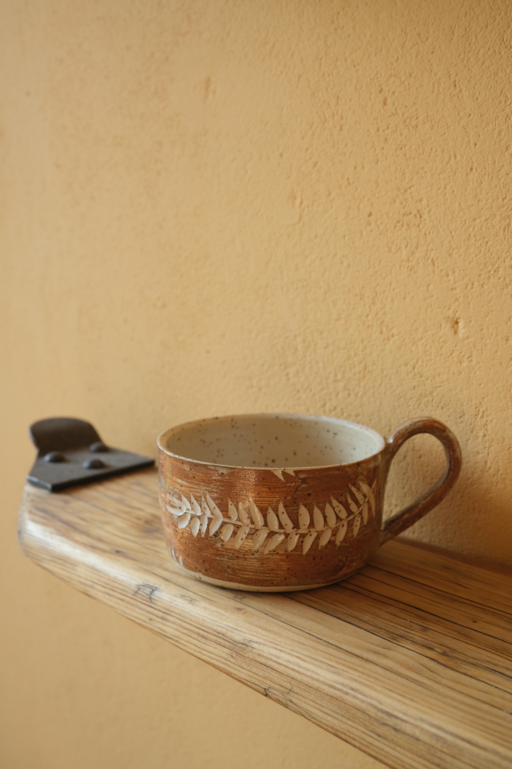 GroßeTasse, unique, 350 ml, H 6cm, Tonfarbe Hellbeige mit Spots, weiß glasiert, außen mit Engobe und Muster gestaltet.