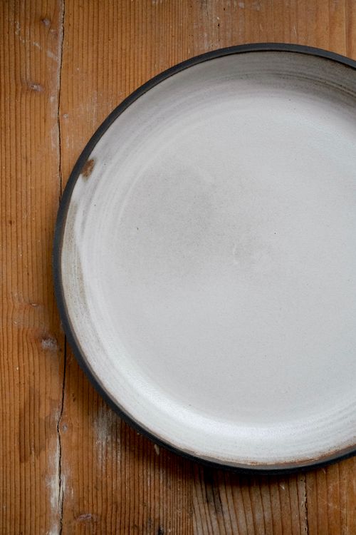 Tonfarbe Schwarz, innen weiß glasiert, mit leicht erhöhtem Rand/ 2cm, Durchmesser 23cm.