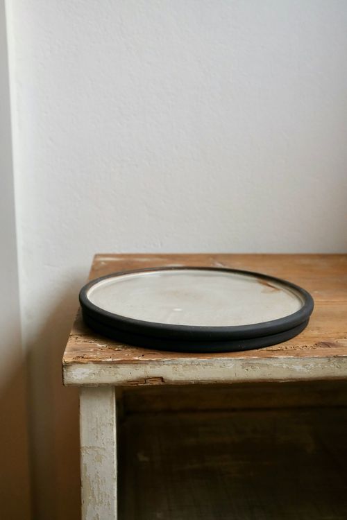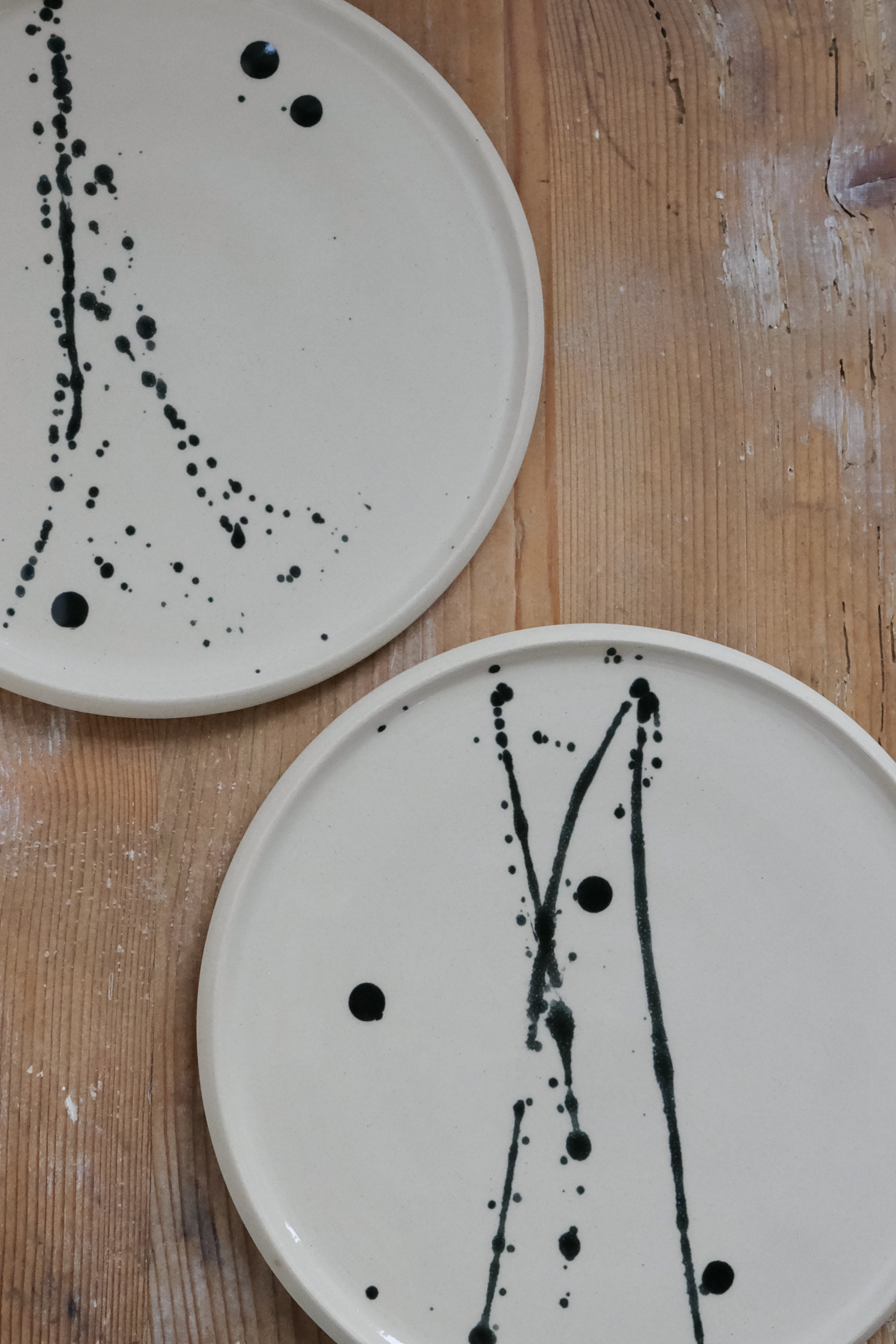 Frühstücksteller und vieles mehr, zwei als Set, Tonfarbe Hellbeige, transparent glasiert mit schwarzen individuellen Klecksen, Durchmesser 20cm.